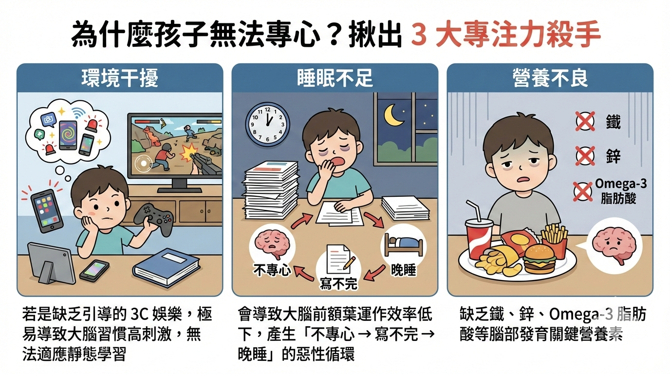 睡眠不足: 發育期的孩子若缺乏睡眠,會導致大腦前額葉運作效率低下,產生「不專心 → 寫不完 → 晚睡」的惡性循環。