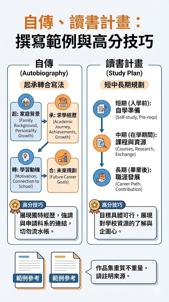 💡 自傳重邏輯: 善用起承轉合(家庭背景 ➡️ 求學經歷 ➡️ 學習動機 ➡️ 未來規劃),明確闡述「為何非這門科系不可」。