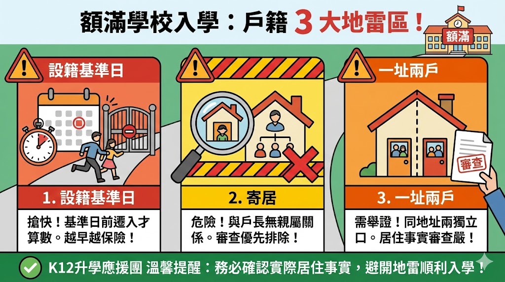 🏫 熱門學校門檻高: 若遇到「額滿學校」,提早設籍是基本,校方還會嚴格審查是否有「實際居住」事實。